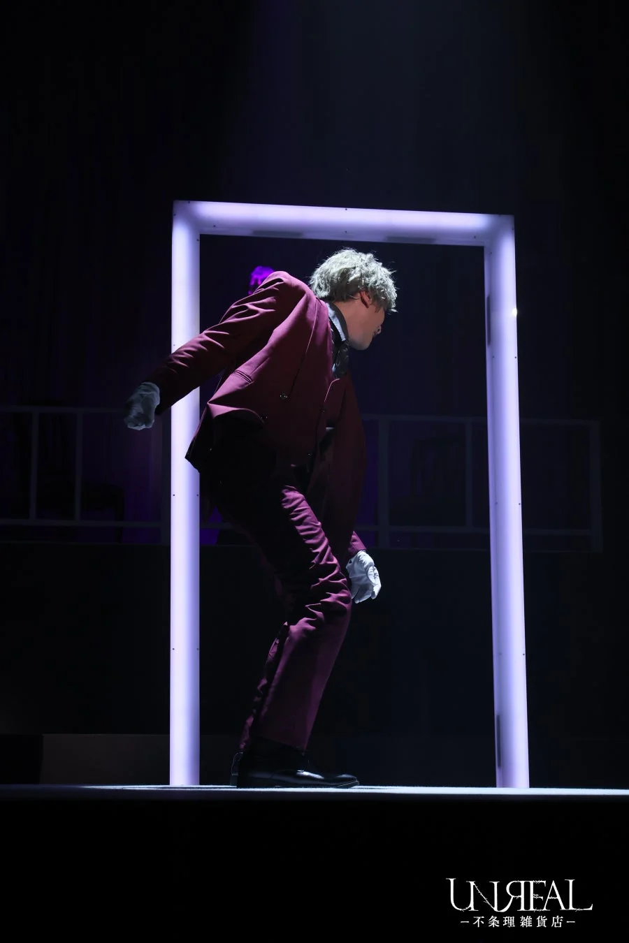暗い舞台で、ワインレッドのスーツと白い手袋を着用した男性が、光る長方形のフレームに身を乗り出すようにポーズをとる姿は、演劇の一場面のような、ミステリアスでドラマチックな雰囲気。
