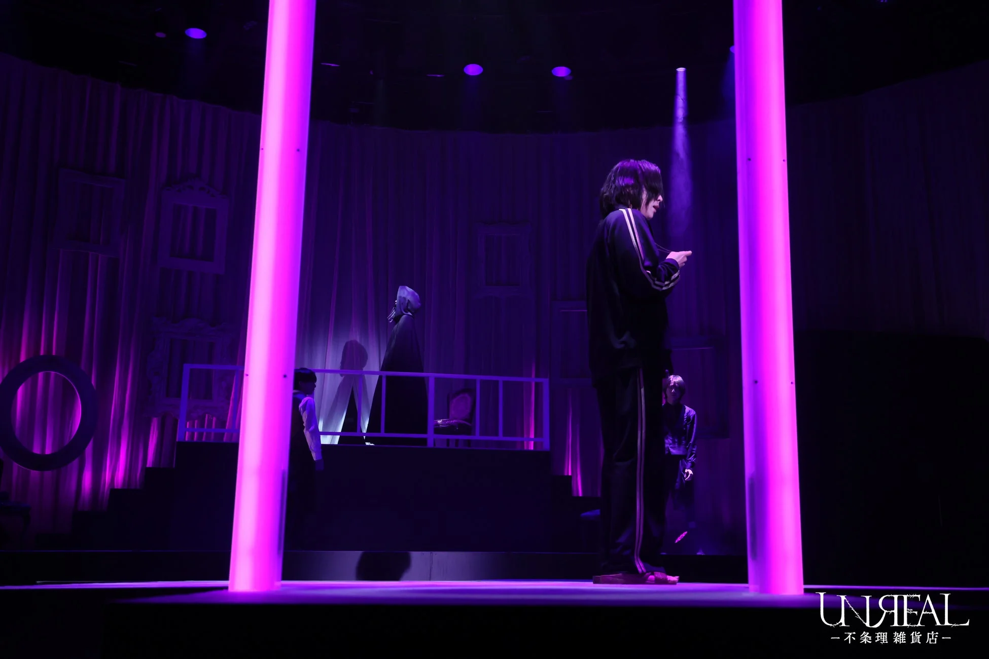 紫色のネオンライトが印象的な舞台で、数人の人物が演じている様子。中央の人物がスマートフォンを見ているように見え、背景にはカーテンや階段、窓枠などのセットが配置され、幻想的でミステリアスな雰囲気を漂わせています。