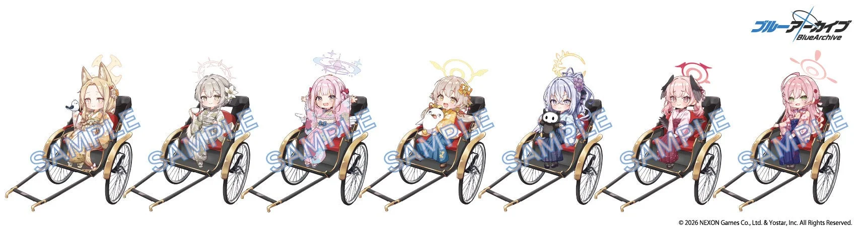 人気ゲーム『ブルーアーカイブ』のキャラクターたちが、和服姿で人力車に乗っている可愛らしいちびキャラのイラストです。グッズ展開のためのサンプル画像と見られます。