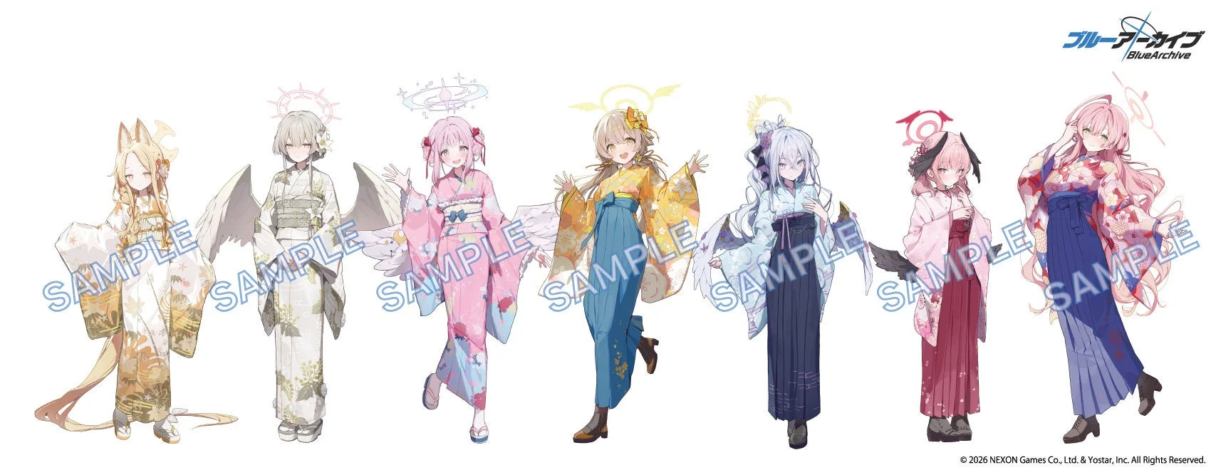 『ブルーアーカイブ』の7人の女性キャラクターが、色とりどりの着物や袴をまとった姿で並んでいます。それぞれ異なる髪色、動物の耳、翼、そして頭上の光輪が特徴的で、和の装いが魅力的なイラストです。