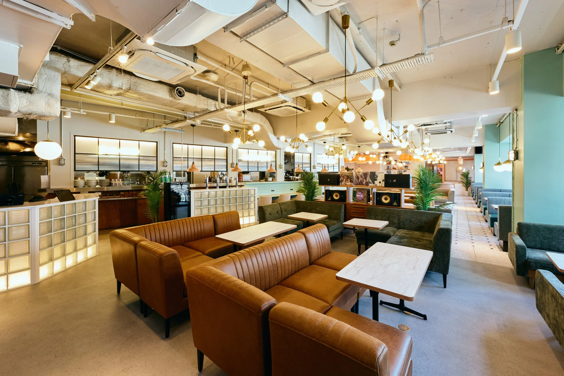 店内にはテラス席、レコードカウンター、ラウンジソファ、ビジネスカウンターなど、様々な用途に対応できる多彩な座席が配置されています。グリーンやターコイズといったくすみパステルトーンと、天然木やガラス素材が調和し、都会の中で心地よく過ごせる活気ある空間を演出しています。この空間デザインは、Berlinaの樋口泰輔氏が手掛けています。彼のウェブサイトはこちらです: http://berlina.co.jp/