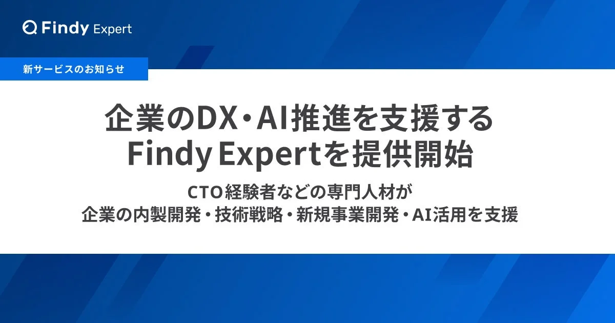 内製開発の推進から、技術戦略の立案、開発体制の構築、そして最先端のAI導入・活用まで、幅広い領域で企業をサポートしてくれる「Findy Expert」。きっと、多くの企業が抱える技術的な悩みを解消し、ビジネスのさらなる成長を後押ししてくれることでしょう。これからの企業のDX・AI推進において、「Findy Expert」がどのような貢献をしていくのか、大いに注目したいですね!