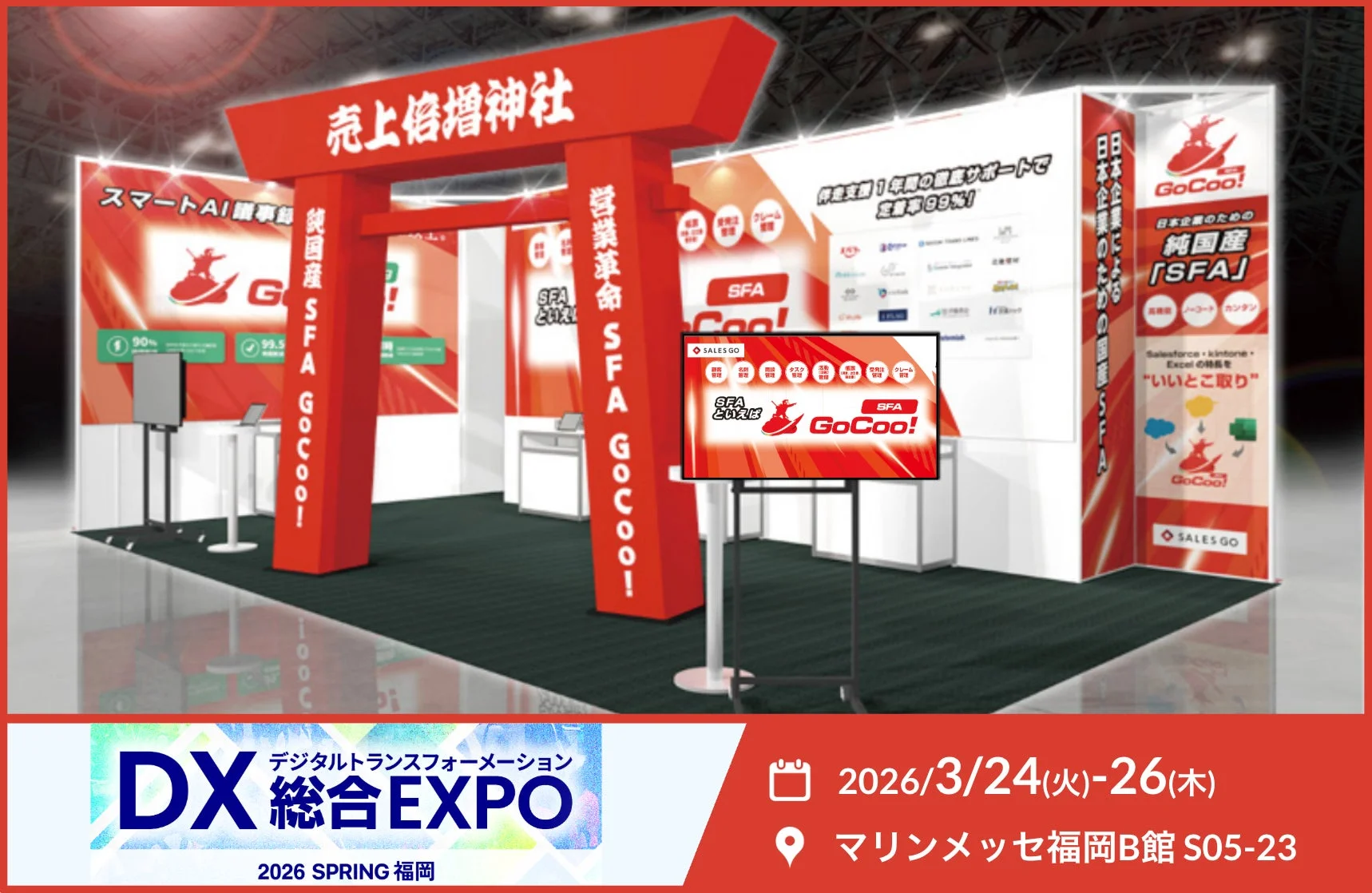 来場者は、このユニークなブースで、営業データの力を借りて売上を倍増させるための「願掛け」ができるかもしれません。AI時代のデータ基盤である「GoCoo! Platform」と、それに基づいた最新のAI対応サービスが、まるで神様のお告げのように、企業の営業DXを強力に後押ししてくれることでしょう。まるでご利益がありそうなブースで、きっと多くのビジネスチャンスが生まれる予感がします。