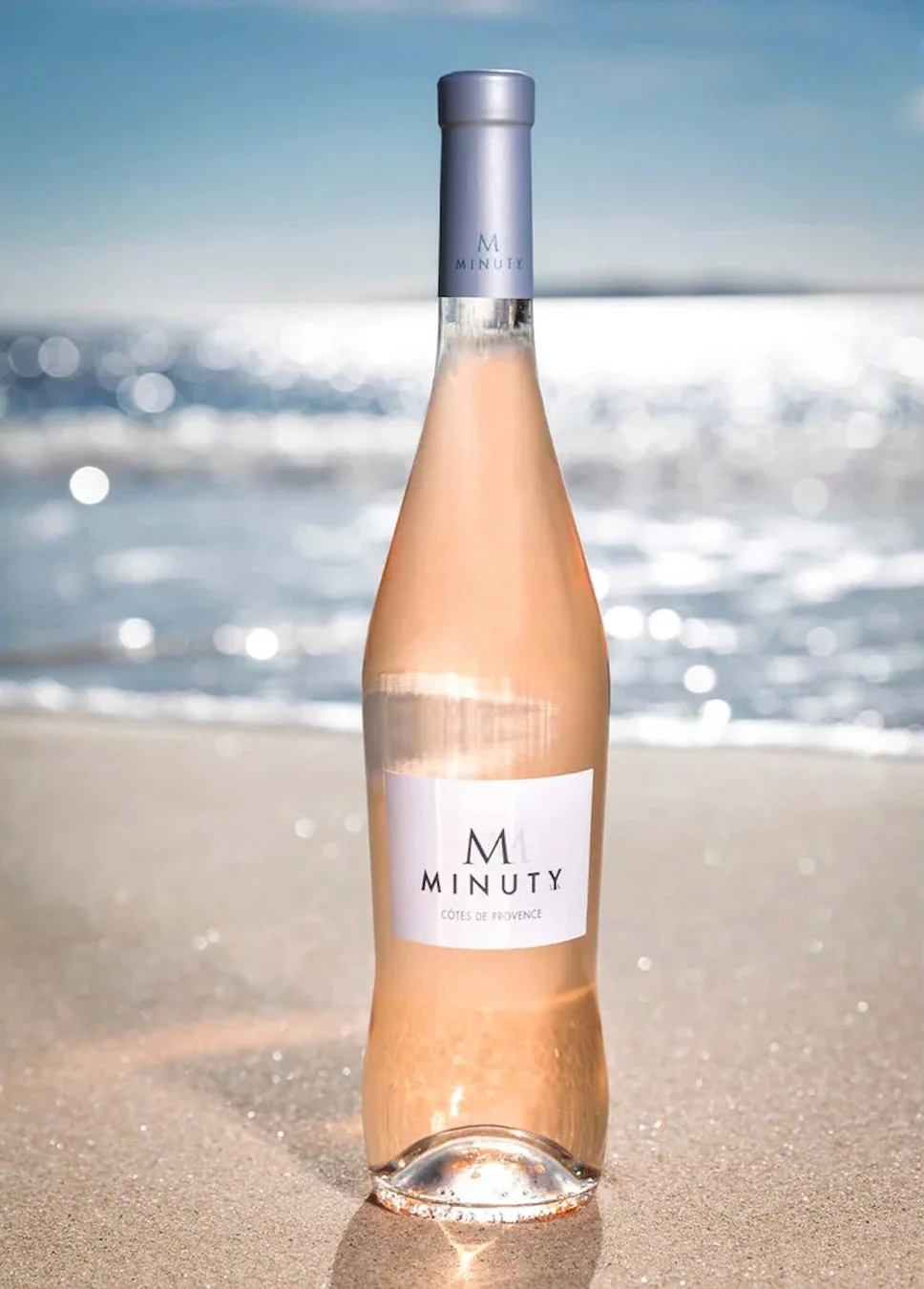 砂浜に置かれたロゼワイン「M MINUTY」のボトルが特徴的な画像です。背景には太陽の光を受けて輝く海が広がり、夏らしい爽やかで優雅な雰囲気を醸し出しています。