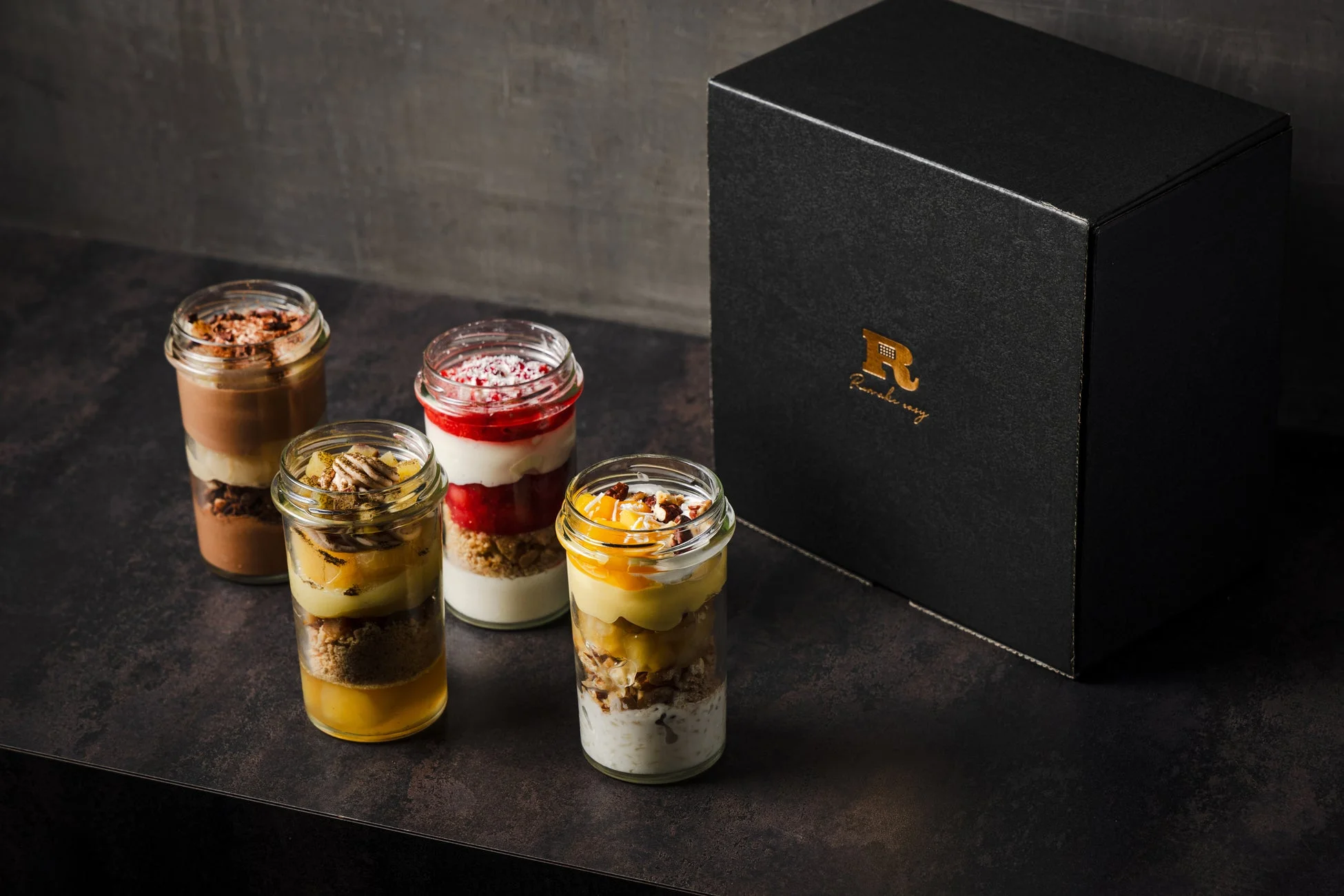 黒ごまアイスのDA-GO-NYANGが見つめる、ユニークなコロネパフェ。パフェの上にはクロワッサンとサクランボがトッピングされており、チョコクリームやコーヒーゼリーとの組み合わせが楽しめます。猫のキャラクターが可愛らしく、食べるのがもったいなく感じるかもしれません。