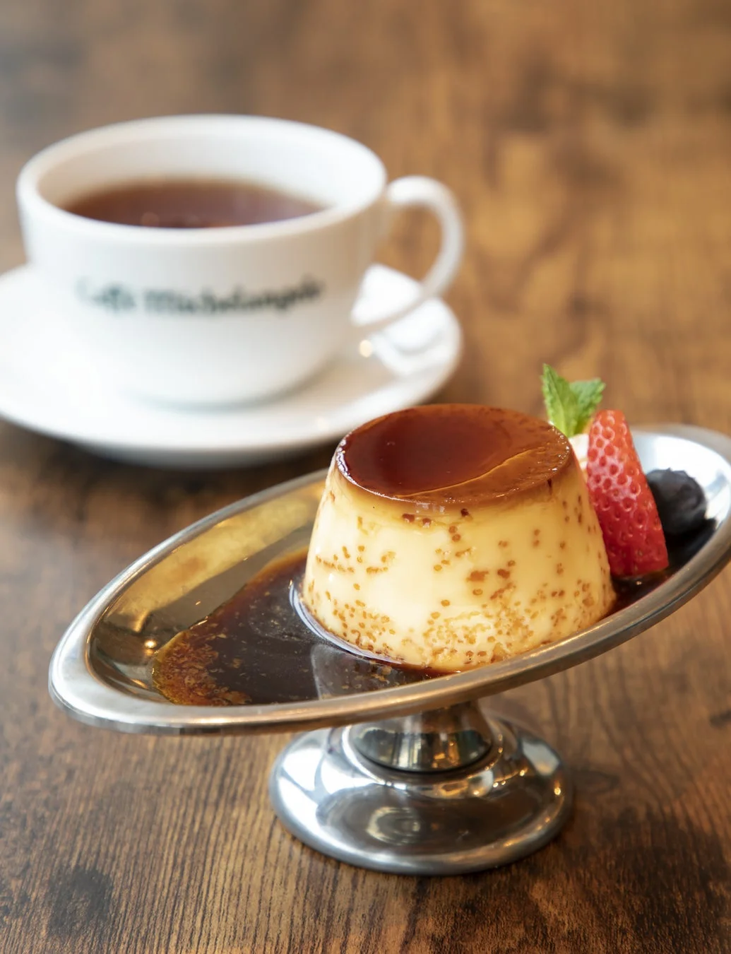 「アルベルゴ カフェ・ミケランジェロ」の人気No.1メニューであるプリンが、アフタヌーンティーにも登場します。とろけるように滑らかな口当たりと、卵の優しい風味が特徴。ほろ苦いカラメルソースが絶妙なバランスで、何度でも食べたくなる逸品です。きっと、このプリンを目当てに訪れる人も多いでしょうね。