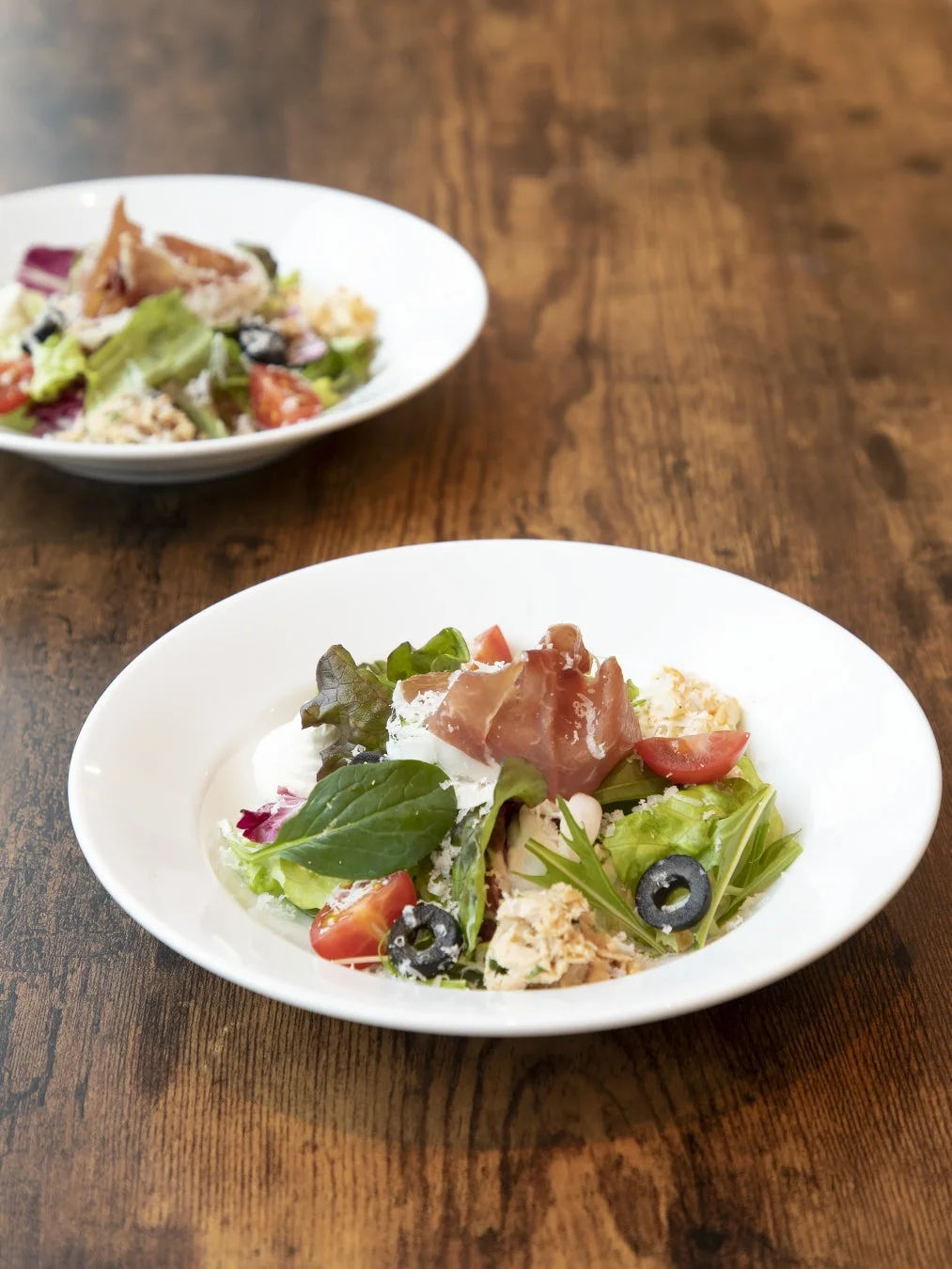 お店の名物である「サラダ ミケランジェロ」のミニバージョンが登場。新鮮なレタスやトマト、オリーブに、生ハムと白いチーズが美しく盛り付けられています。彩り豊かで、シャキシャキとした野菜の食感が、口の中をさっぱりとさせてくれます。